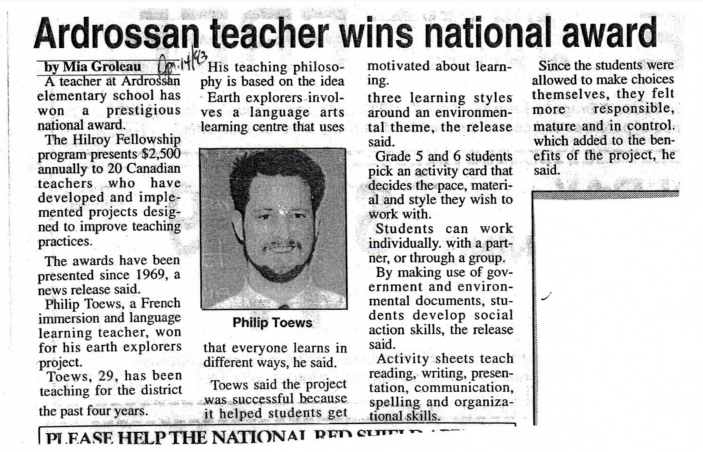 A $2500 award from the Canadian Teacher’s Federation for outstanding innovation in teaching. This award was in particular recognition for my combination of self-directed learning, learning styles and project-based learning for grade 5-6.